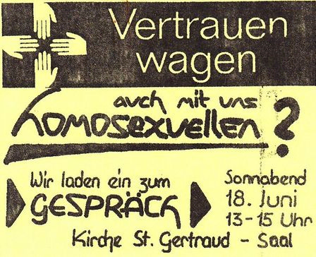 hat die Evangelischen Akademie Berlin-Brandenburg (DDR) am 9. Januar 1982 zu einem »Sonnabendgespräch« eingeladen. Dieser Einladung folgten viele Homosexuelle aus der DDR. Nach diesem Gesprächsabend trafen sich am 13.04.1982 Interessierte in den Räumen der Evangelischen Akademie. Dr. Manfred Punge informierte über das Echo der Akademie-Veranstaltung. Viele der Teilnehmer wollten die Fragen aufgreifen und die Gespräche fortsetzen. Dazu wurde eine Anbindung gesucht und gefunden. Der »Gesprächskreis Homosexualität« war gegründet. Von Anfang an dabei Peter Birmle und sein Lebensgefährte Volker Gasser.
