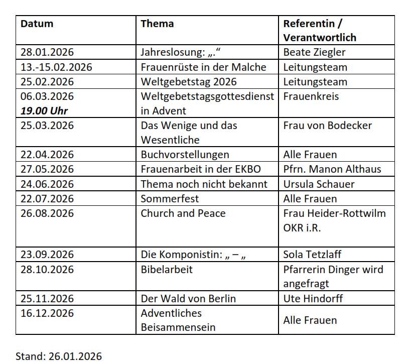 Wir begrüßen Sie gerne zum Gesprächskreis in der St. Bartholomäuskirche, zum Bibelgespräch, zum Senioren- und Frauenkreis und zum Yoga-Kurs in der Advent-Kirche.
